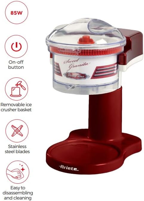 Цей ізмельчитель не лише допоможе вам готувати освіжаючі напої, але й стане невід'ємною частиною вашого дому під час вечірок та святкувань. Легкий у використанні і легкий у чищенні, він стане незамінним помічником у створенні найсмачніших десертів та напоїв. Насолоджуйтеся прохолодою та смаком з Iзмельчителем льда Ariete 78 Sweet Granita у вас вдома!